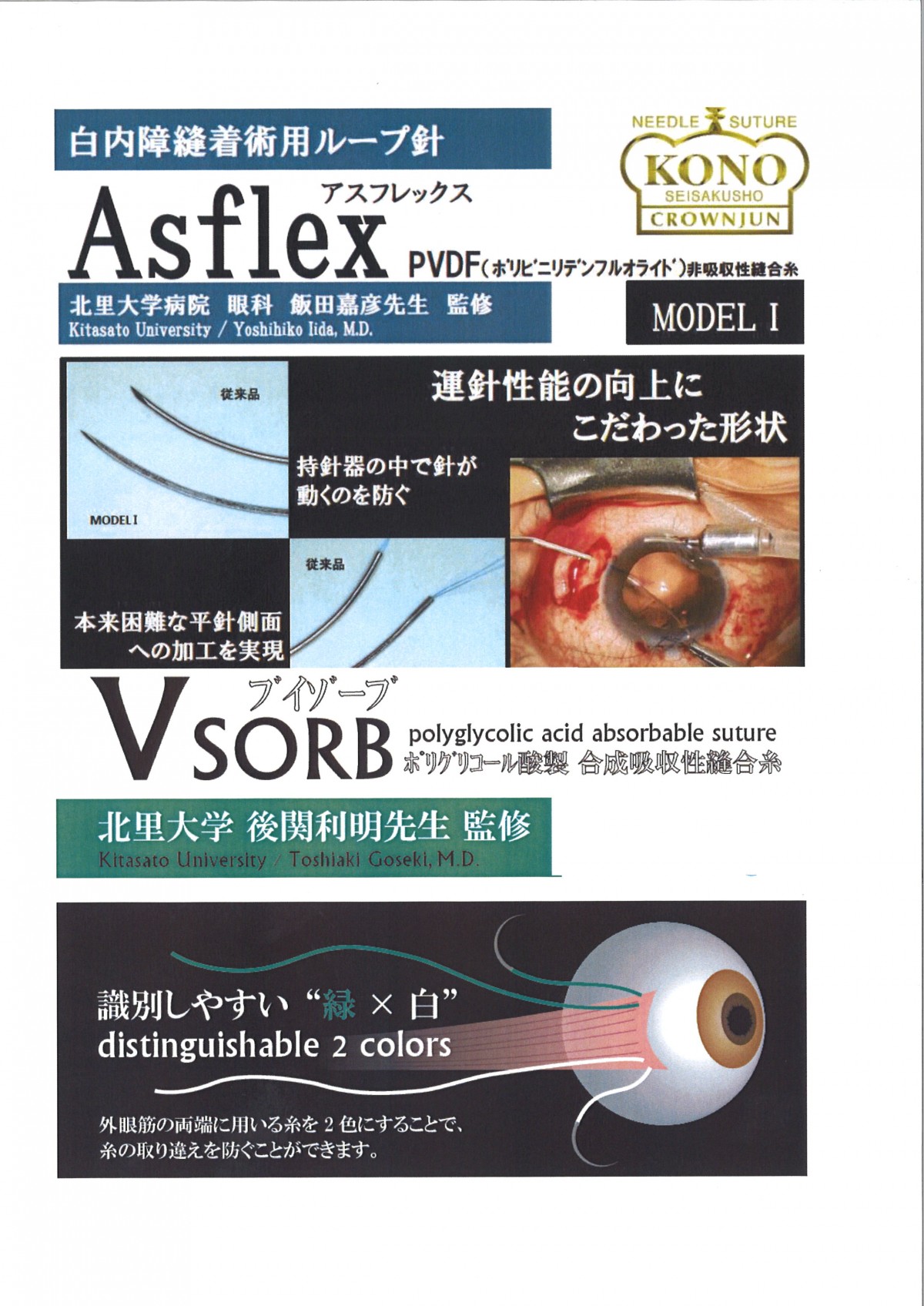 現在の斜視手術の原型は前世紀にほぼ完成した術式で、進歩のない手術であると思われがちである。その反面、白内障手術や網膜硝子体手術の進歩は目覚ましいものであり、その進歩の一旦は手術機器の進歩によるものと思われる。その為、大掛かりな手術用機器を使用しない斜視手術にとっては、進歩する機会は少なかった。しかしながら、斜視手術に使用する機器の中にも見直しが必要なものはあり、筆者は外眼筋に使用する縫合糸に注目をした。一般的にどの縫合糸も、1パックに入っている糸の色は同じ色である。それを筆者はクラウン・ジュン河野製作所の協力の下、違う色(白×緑)の糸を1本づつ(計2本)入っているパックを作成した。この糸を使用することで、糸の取り違いを防ぐことができる。また、糸を色で識別することで手術教育が向上した。色を変えるというシンプルな発想だが、そのメリットは大きく、斜視手術以外の応用も期待できる。