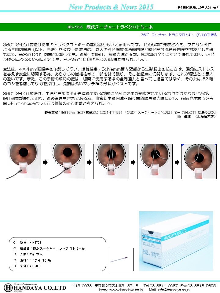 今回の講演では、スーチャートラベクロトミー原法と変法との違い、眼外法と眼内法の違い、さらに使用する糸が完成までの道程についてお話したい。