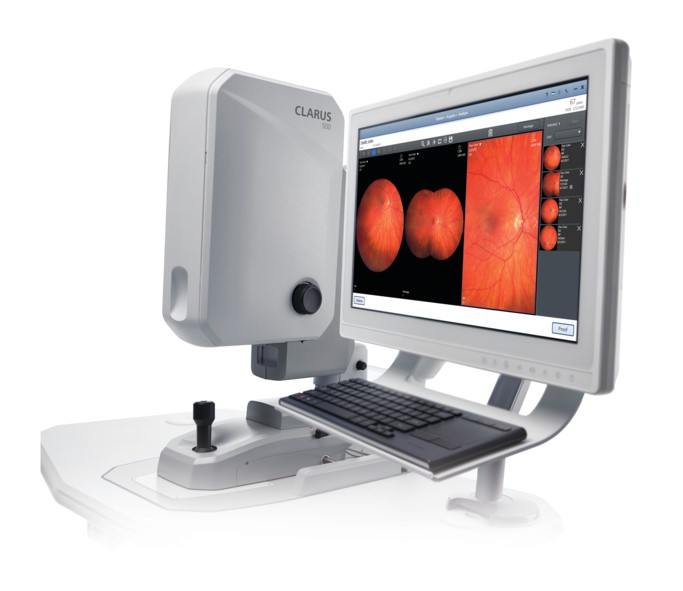 CLARUS500は、超広角、高画質、自然色カラー画像を最大の特徴として今年2月に世界同時発売されました。従来の眼底カメラでは1回の撮影で画角50度に対し、CLARUSは無散瞳でも瞳孔径が2.5mmあれば、1回の撮影で133度、2回の撮影で水平方向200度、4回の撮影で水平・垂直200度の画像が得られます。これは、網膜疾患、特に糖尿病網膜症前駆病変、網膜裂孔などは周辺網膜に観られることが多々報告されており、以前にも増して周辺網膜の観察は重要となっている背景に沿うものです。