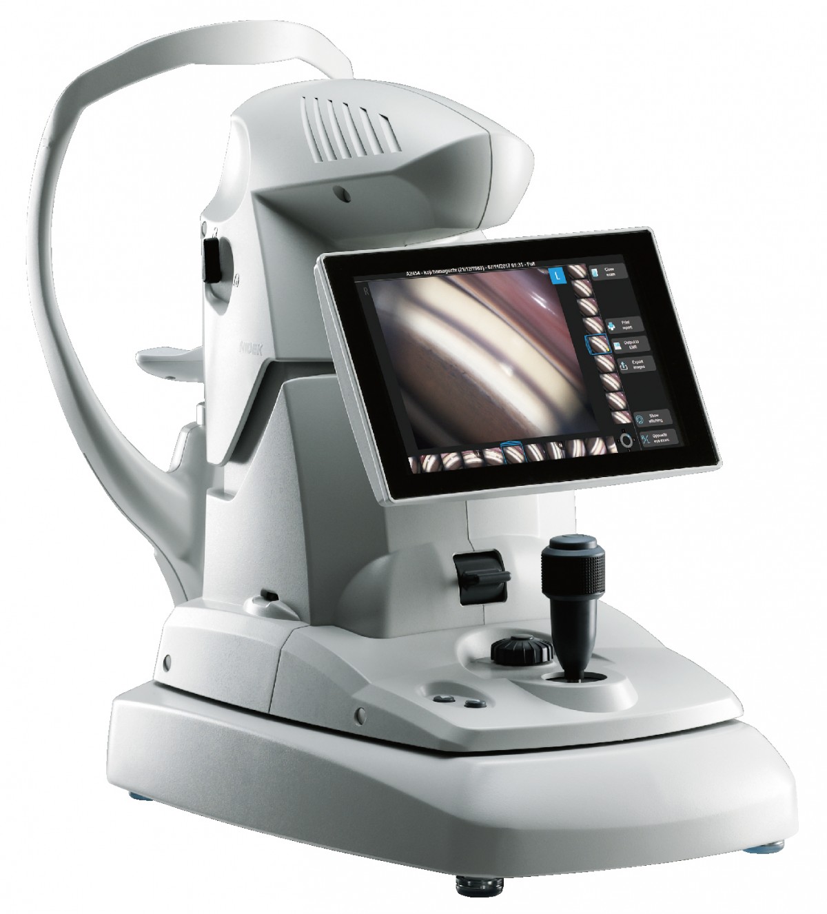 ゴニオスコープGS-1は隅角部位を撮影する専用装置として隅角全周領域を16枚のカラー画像として取得します。専用ゲルによる接眼システムの採用により角膜を圧迫しない状態での撮影を実現するとともに、トラッキング機能による位置合わせを行うことで撮影の再現性を高めています。